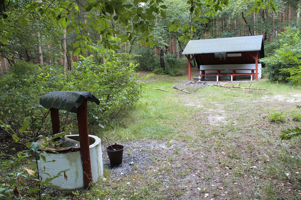 Studnia w środku lasu, obok tabliczki wskazujące dawnych mieszkańców. Wieś, której już nie ma