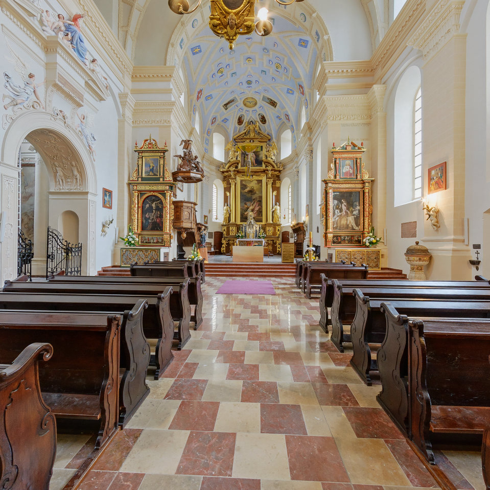 Monumentalna bryła kościoła farnego, w połączeniu z Górą Trzech Krzyży – symbolicznym odpowiednikiem Golgoty – góruje nad rynkiem oraz panoramą miasteczka.